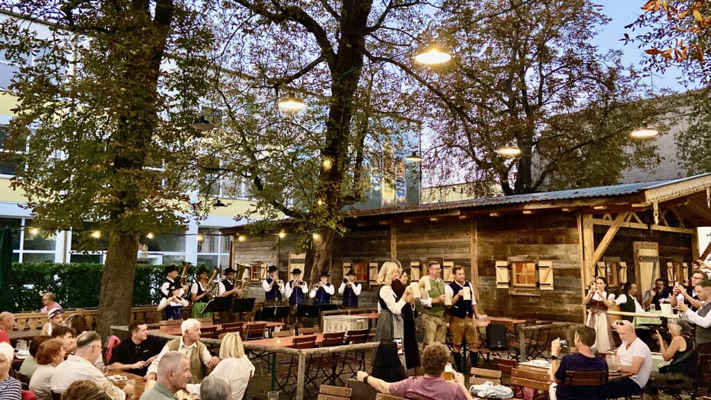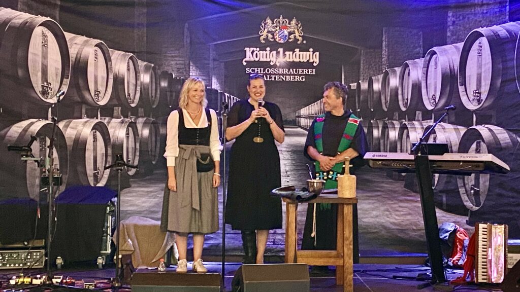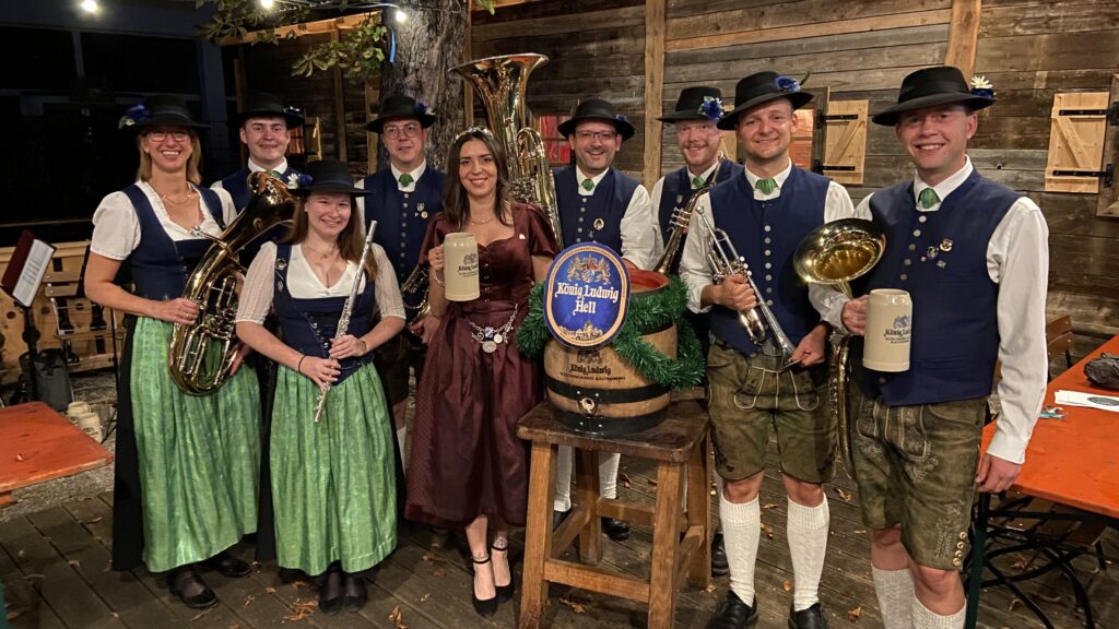 Im Anschluss zapfte die Bayerische Bierkönigin Anna mit zwei Schlägen ein Fass an, begleitet von „Ein Prosit der Gemütlichkeit“, und der Vorabend klang mit einem kühlen Schluck Bier und unserer Musik aus, bevor es in die Halle ging zur Party mit Live-Band.