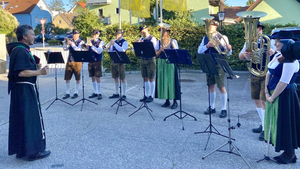 Bei herrlichem Wetter genossen die Gäste im Biergarten eine Brotzeit und unsere Blasmusik. Dann wurde es in der Halle im Beisein von Oberbürgermeister Christian Götz und den Festgästen feierlich. Der aus Emmering stammende Franziskaner-Ordensbruder Christian lud zu einer besinnlichen Andacht ein. Er hielt uns zugleich nachdenklich und humorvoll vor Augen, dass wir alle die Einstellung haben sollten, einander von Herzen zu dienen und nicht, sich bedienen zu lassen – unabhängig von der jeweiligen Position, die man innehat. Nur so könne Gemeinschaft gelingen.