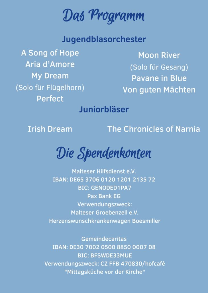 „Unserer Jugend ist es ein Anliegen, mit dem Benefizkonzert auch heuer wieder einen Beitrag zum gesellschaftlichen und sozialen Zusammenhalt zu leisten“, so Dirigent Paul Roh. Zu hören sein werden wunderbare Musikstücke, so u.a. „A Song of Hope“, „Pavane in Blue“, „Aria d’Amore“, „My Dream“ (Solo für Flügelhorn), „Perfect“, „The Chronicles of Narnia“, und weitere Melodien. Das Jugendblasorchester und die Juniorbläser freuen sich auf zahlreiche Zuhörer und von Herzen kommende Spenden.