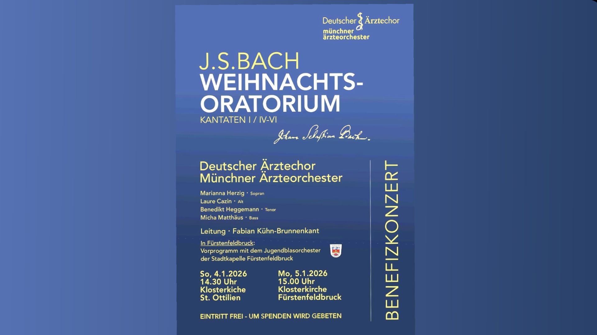 Es ist uns eine große Ehre und Freude! Am Sonntag, den 5. Januar 2026 führt der Deutsche Ärztechor zusammen mit dem Münchner Ärzteorchester um 15:00 in der Klosterkirche das Weihnachtsoratorium …